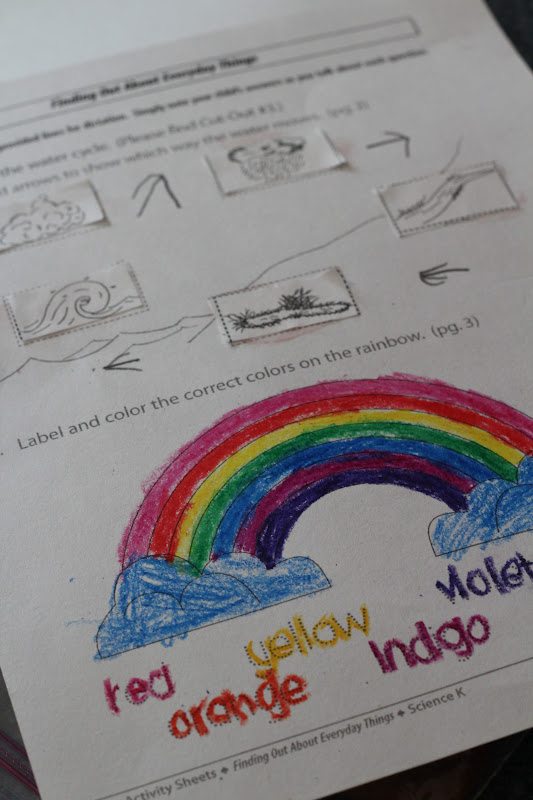 This week we added math, science, and history/geography. She is loving the math and science so far as it is so hands on. We learned about rainbows, the rain cycle, thunder/lighting, and snow. Writing has been a chore this week and think she just gets bored with doing it...she knows it's long and she knows how to do it so I think she just doesn't want to. After a couple of days, her assignments change and they will hopefully be more fun. She cried most of the day yesterday and that was frustrating for me. I think she has just had a lot of changes plus lack of sleep do to roofers and vacation. We also implemented a "no blankie" rule. Her blankie has to stay in her room at all times. I think that is the biggest source of her emotional-ness.